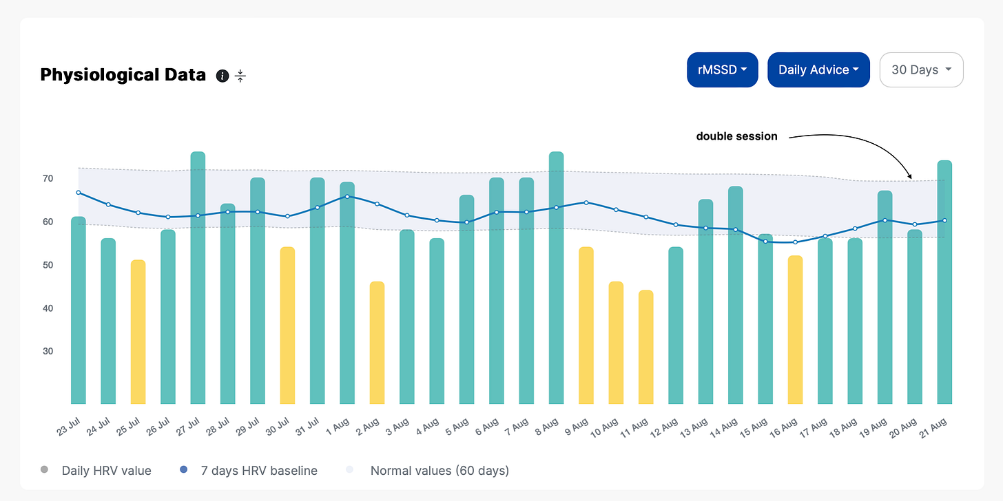 I have found the suppression in HRV after two days of high intensity quite systematic, as we can see above (happening every time I did such sessions), as well in some of my past data where these sessions were less frequent. On the other hand, I am currently responding well to a single high-intensity session, which does not lead to a suppression in HRV the following morning.