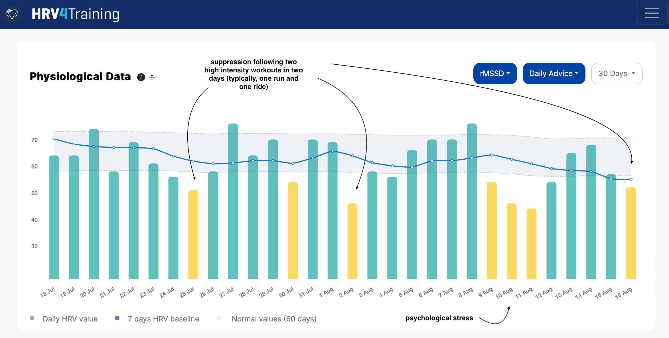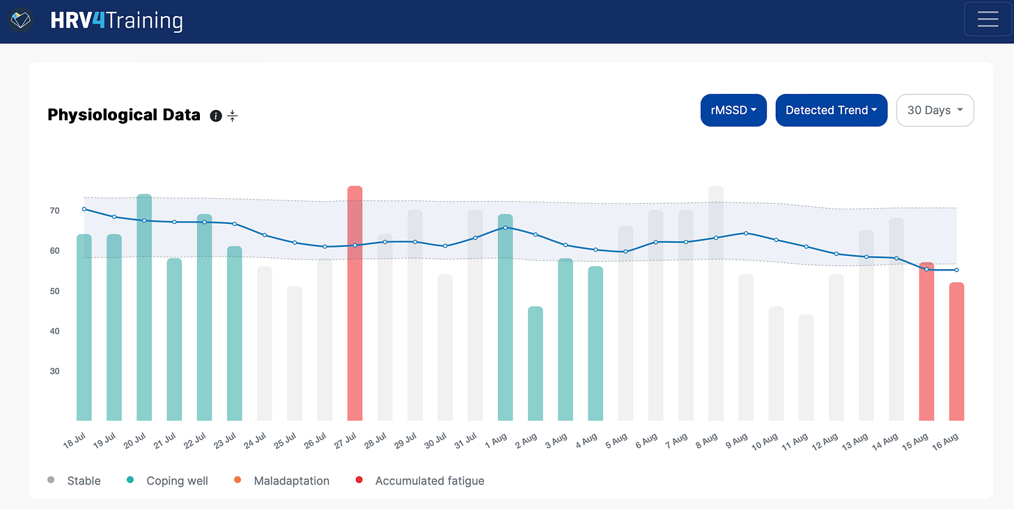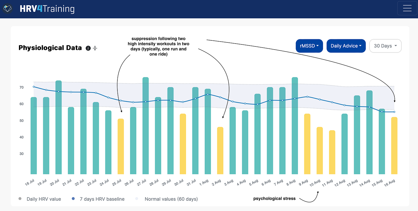 Below is my recent HRV data, showing clear suppressions in response to physical stress (back-to-back days of high-intensity training) as well as psychological stress (long story):