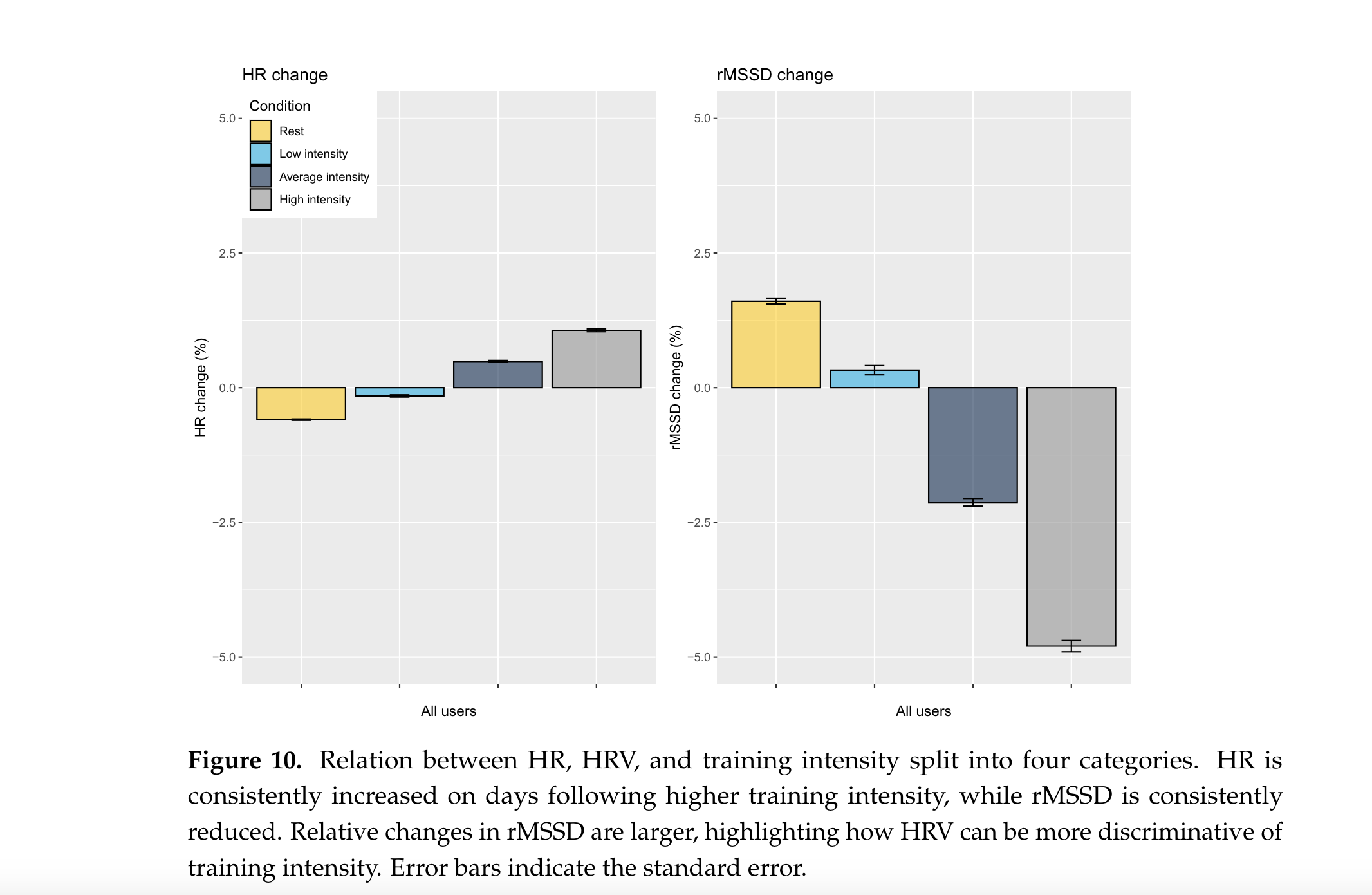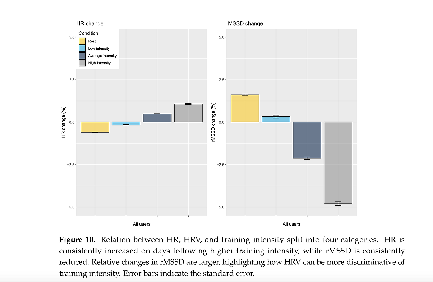 We have shown in our research (paper here) and other examples on this blog how HRV tends to be more sensitive to stressors, which is the whole point of measuring our body’s response to things like training and other psychological stressors (let’s move away from sickness and alcohol as the only case studies, please).