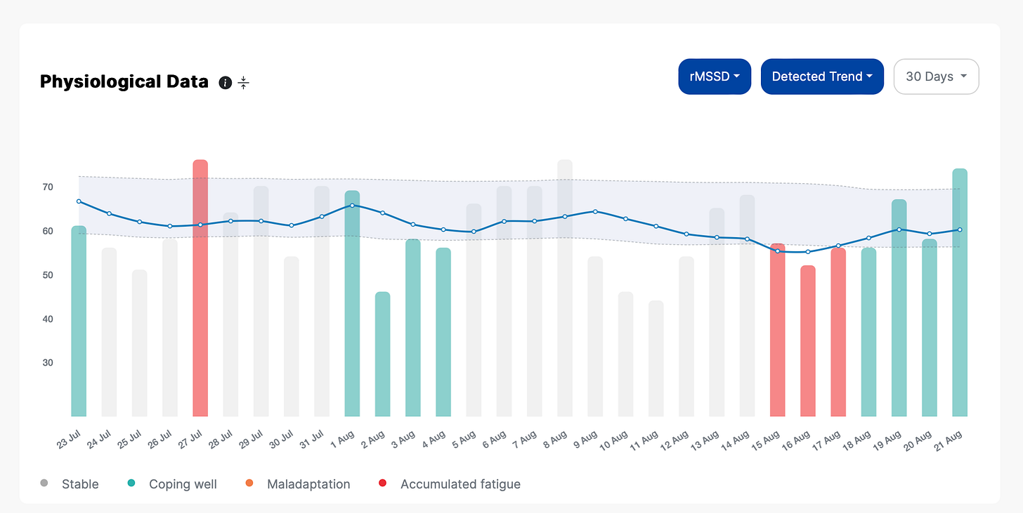 A note here on scores in wearables, in case you are trying to look for these patterns in your device: if you look at your data confounded by behavior, e.g. a recovery or readiness score that includes activity levels and / or sleep time, you are not looking at your body’s response (!) and cannot learn about how you are adapting to a given stimulus (maybe your physiology is normal, but you slept a bit less - an irrelevant factor that would however drive the readiness / recovery score to a lower value). The only way to analyze our response and learn from it is to look at the physiology alone, with respect to our normal range, without penalizing it based on behavioral factors. Behavior is key context, but if you want to understand your response, then what you want to look at is the physiology.