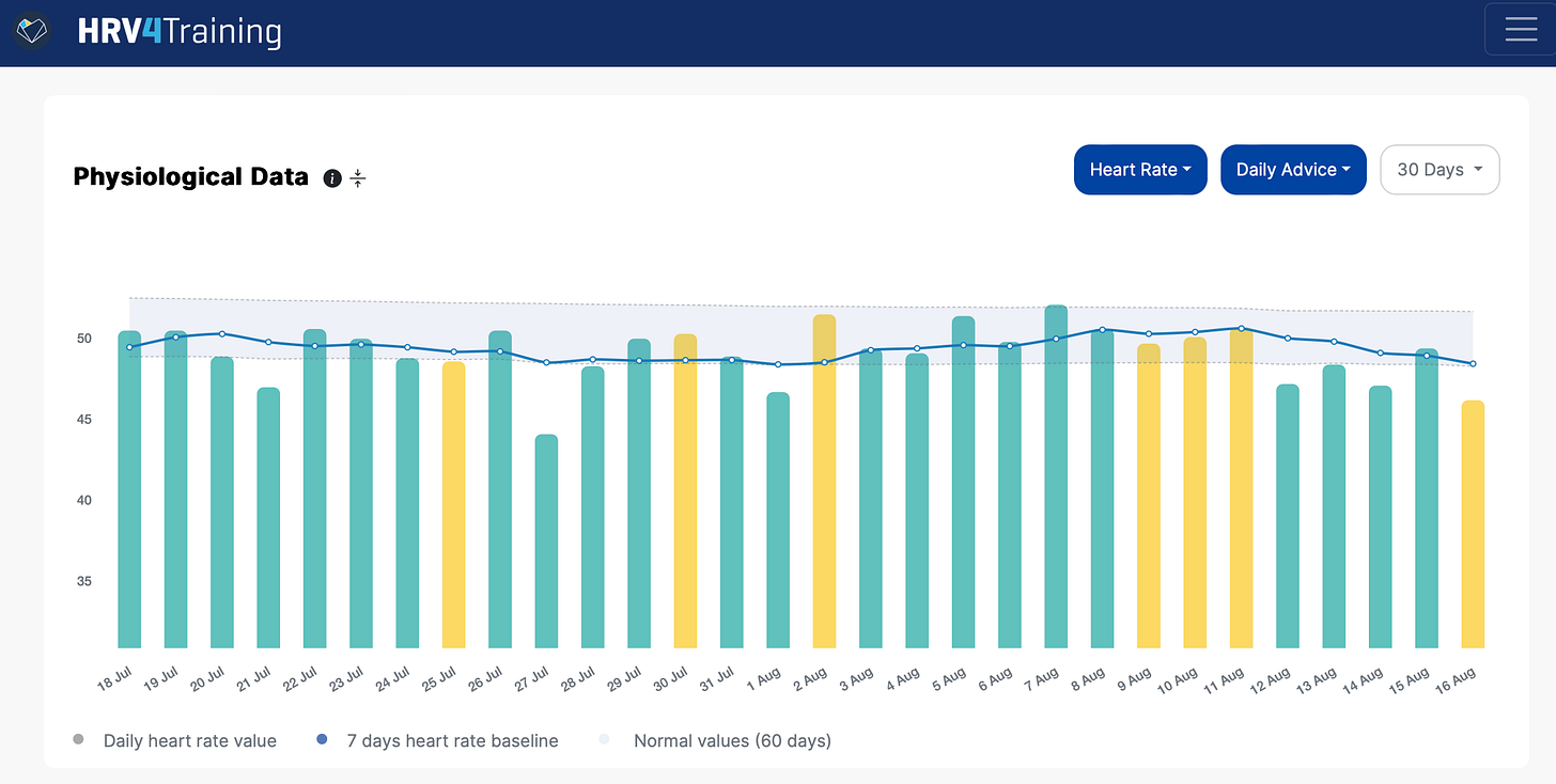 I believe this is the main reason why it is useful to track HRV, as a more sensitive marker of the stress response. In my data above, which I used as an example, we can see how heart rate remains always within my normal range, despite suppressions in HRV that I could easily link to physical and psychological stressors in the past few weeks.