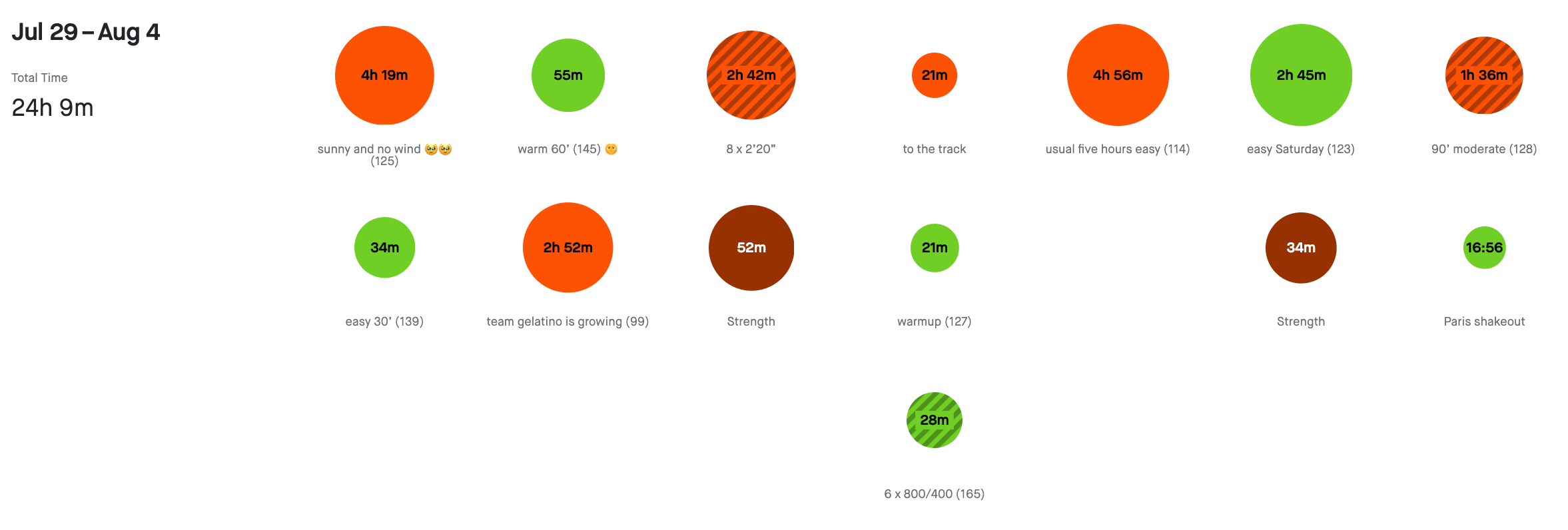 An example week is the following, with the two workouts falling on a Wednesday and a Thursday (full log on my Strava, here):