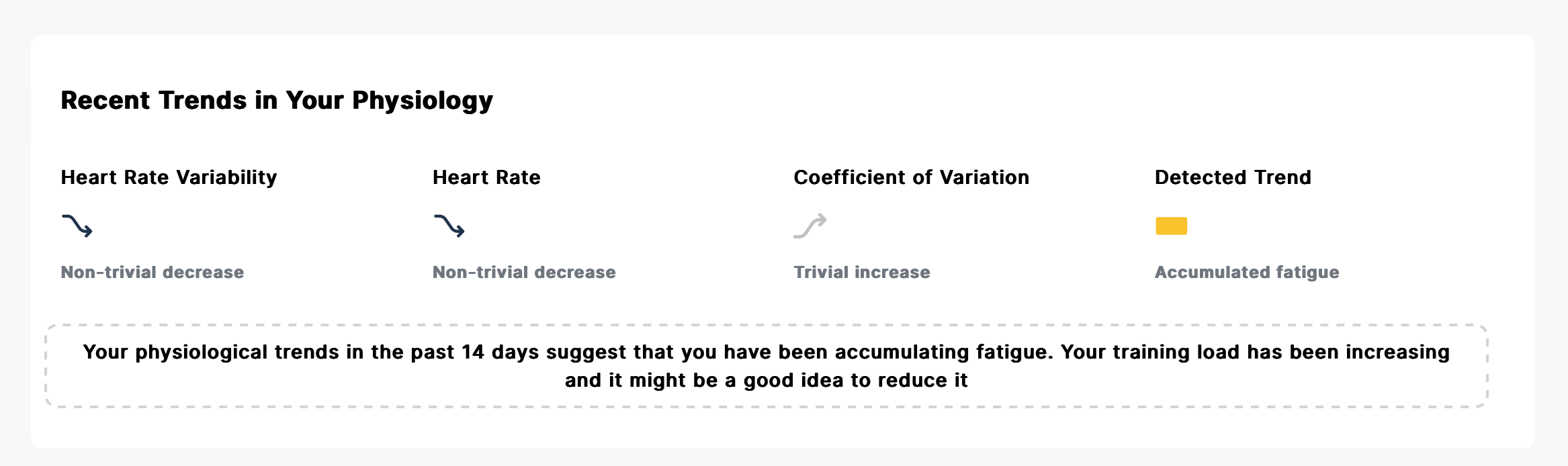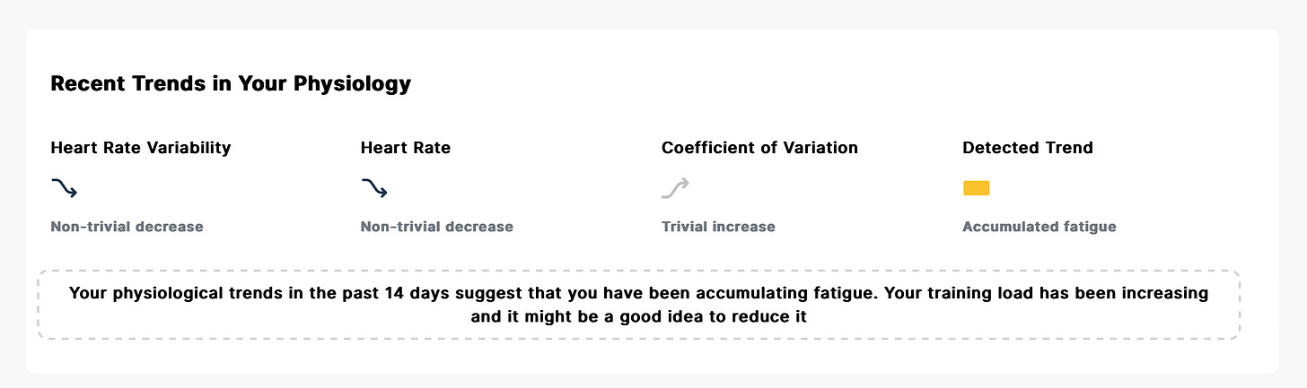 In the HRV4Training Pro screens below, both heart rate and HRV are used to estimate your current state, looking at longer-term trends in these parameters as well as the coefficient of variation. In particular, my data right now shows accumulated fatigue, resulting from a reduction in HRV, with stable or even suppressed heart rate, and increased coefficient of variation (even though this is deemed trivial, and therefore irrelevant to the estimate).